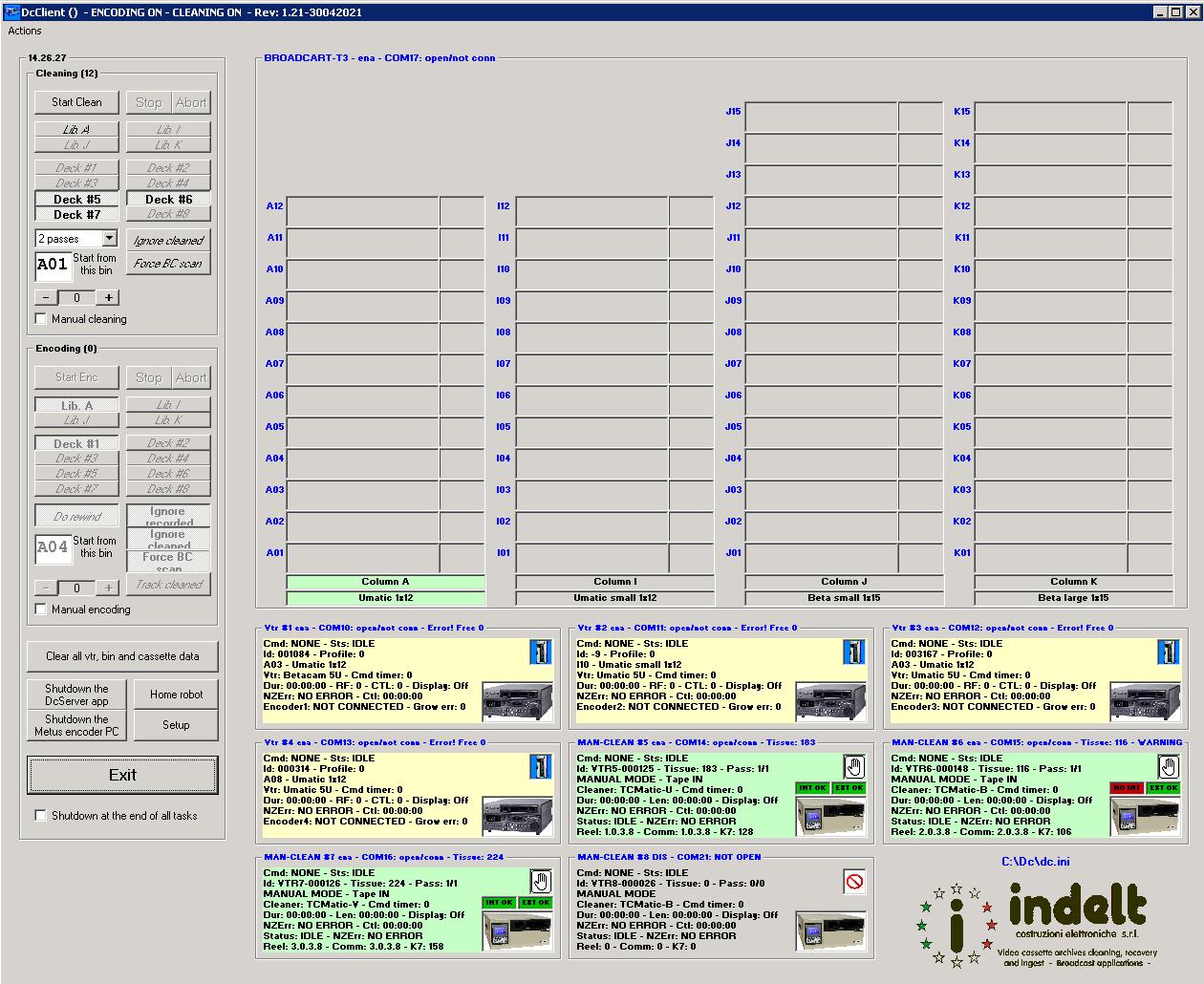 Both Indelt DigiCart and Metus Ingest server, used to encode up to eight independent streams, are running on a server class PC. The server manages a local storage of about 8 TB, configured as RAID10, that is used as a temporary buffer for the recorded files that will be moved by the operator to the final destination after being checked. Both vtr and cleaners may be used in any configuration up to a maximum of eight and may be managed by the robotics or operated manually as preferred.
